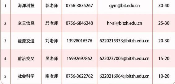 请应聘者将个人详细简历(含教育与工作经历、研究方向、学术成果等)发送至学域邮箱(详见下面表格:各学域联系方式),同时抄送至校区高层次人才办公室邮箱rcb@bitzh.edu.cn请将邮件标题命名为“本人姓名+应聘岗位+专业领域”(示例:张三+准聘教授+海洋科技),可同时附上其他成果证明材料。