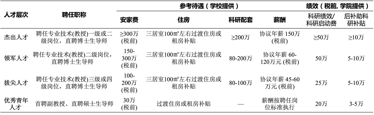 注:学院配套绩效(科研启动费分3笔支付,报到2个月后即支付第一笔,一年后支付第二笔,首聘期中期考核合格支付第三笔;聘期考核良好以上可以申请后补助。在规定的科研绩效/科研启动金额内,具体的科研绩效/科研启动经费所占比例,由教师自主决定,经学院报学校审批后执行。)